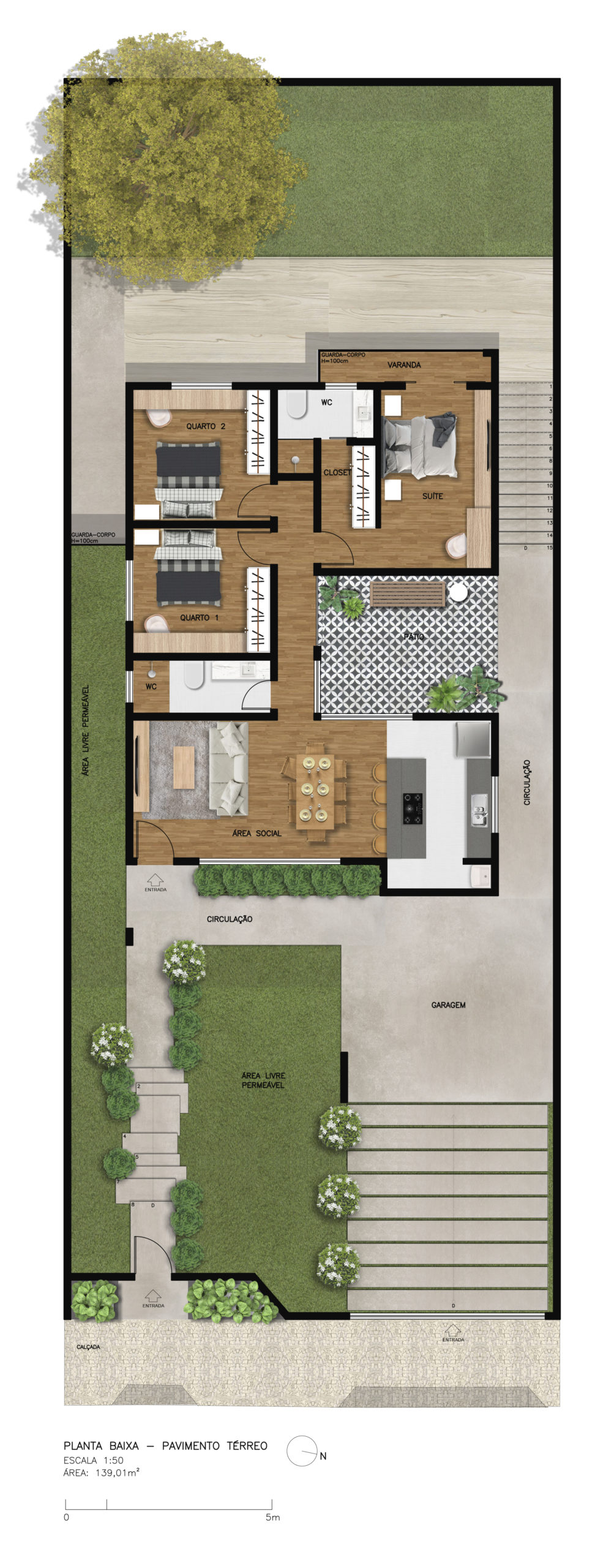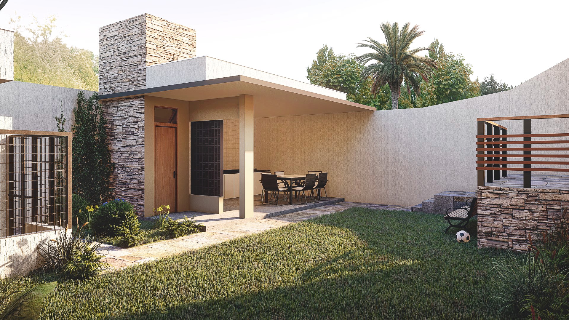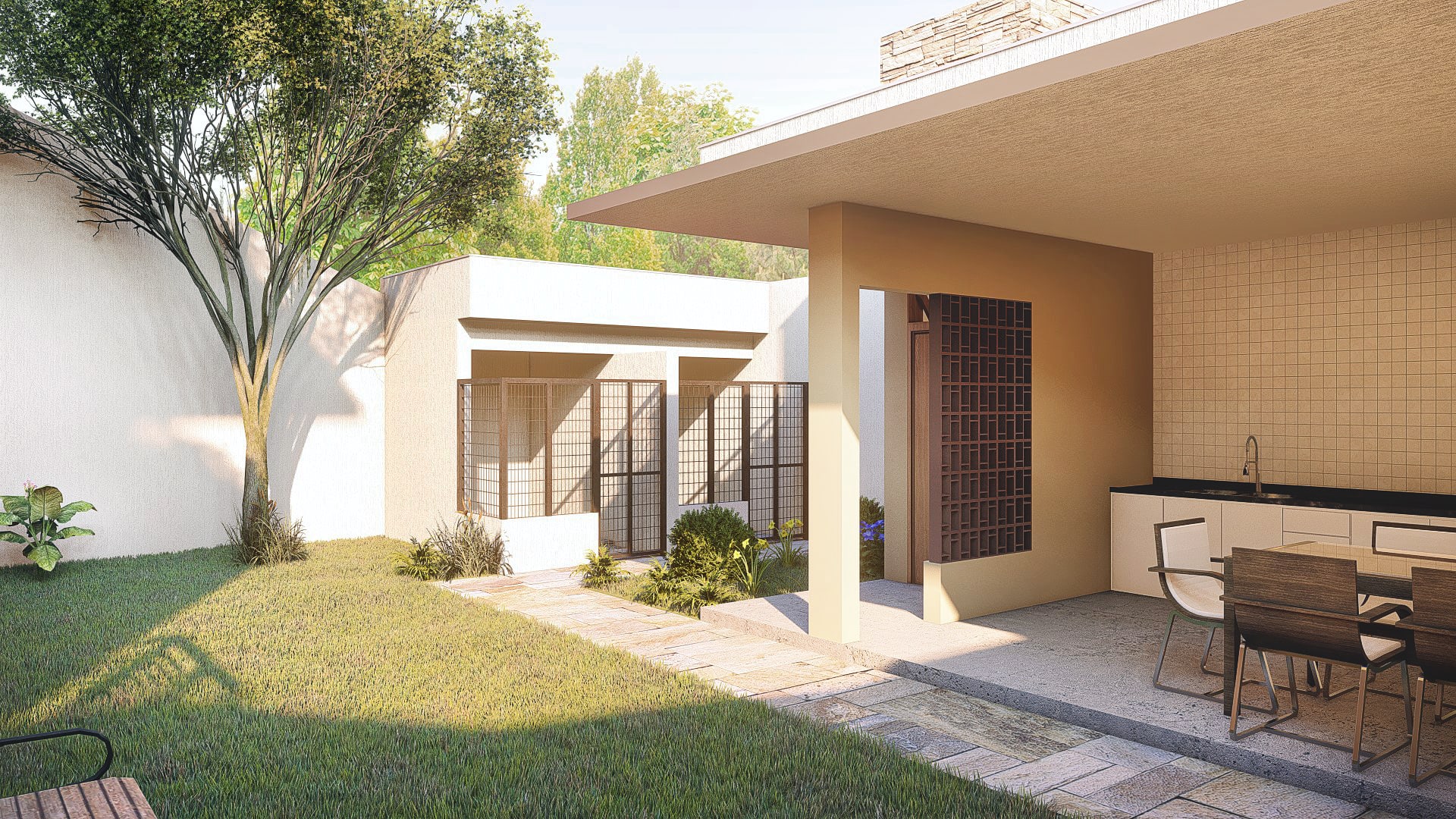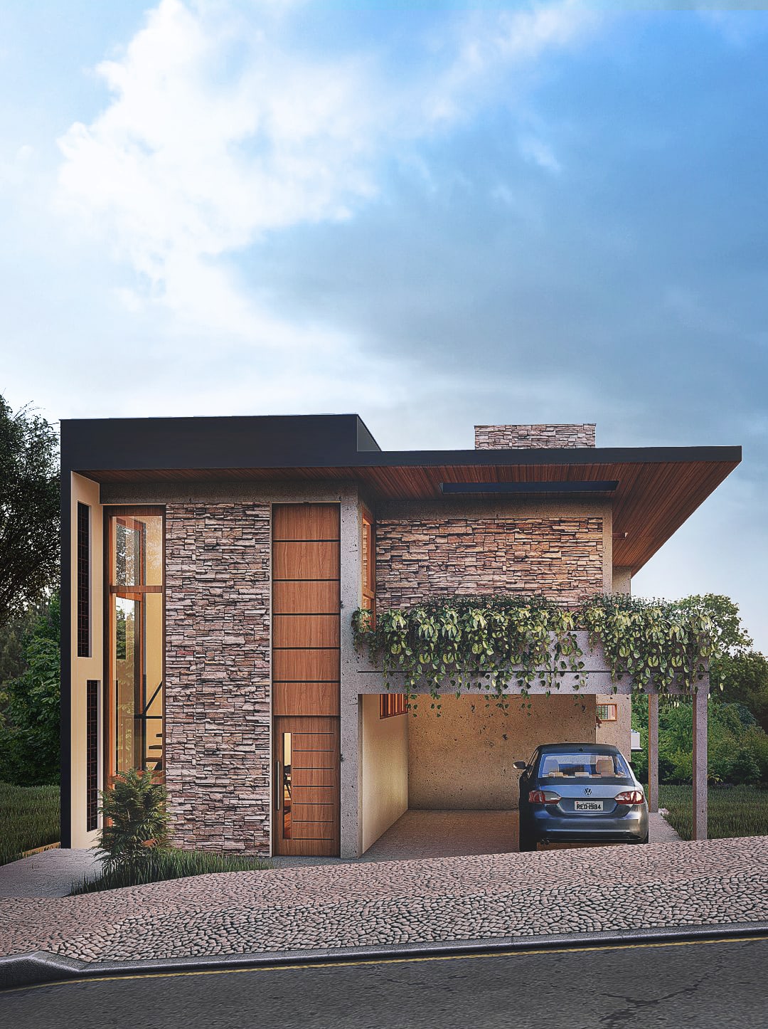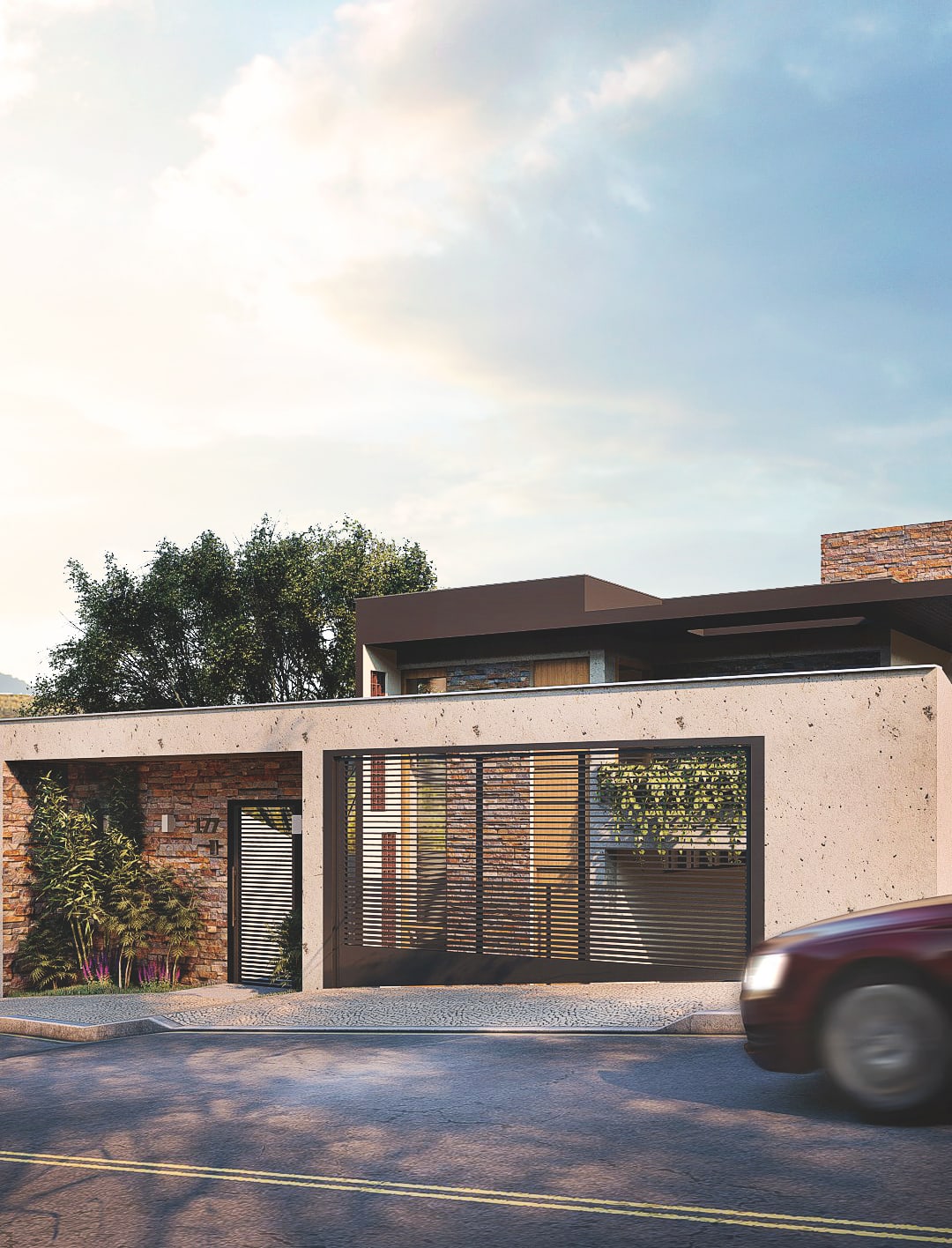 O casal gostaria de uma casa com estética contemporânea, esquadrias de madeira e uma sala de entrada com pé direito duplo. As áreas sociais deveriam ser integradas, mas articuladas de forma a manter a independência das atividades de cada ambiente.