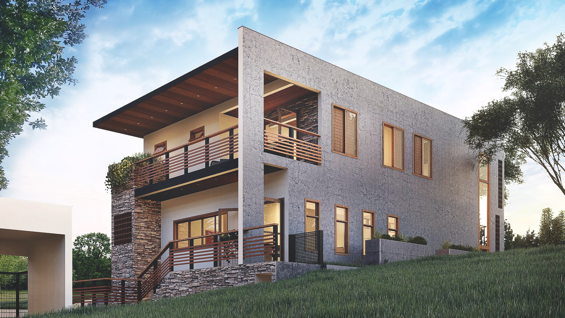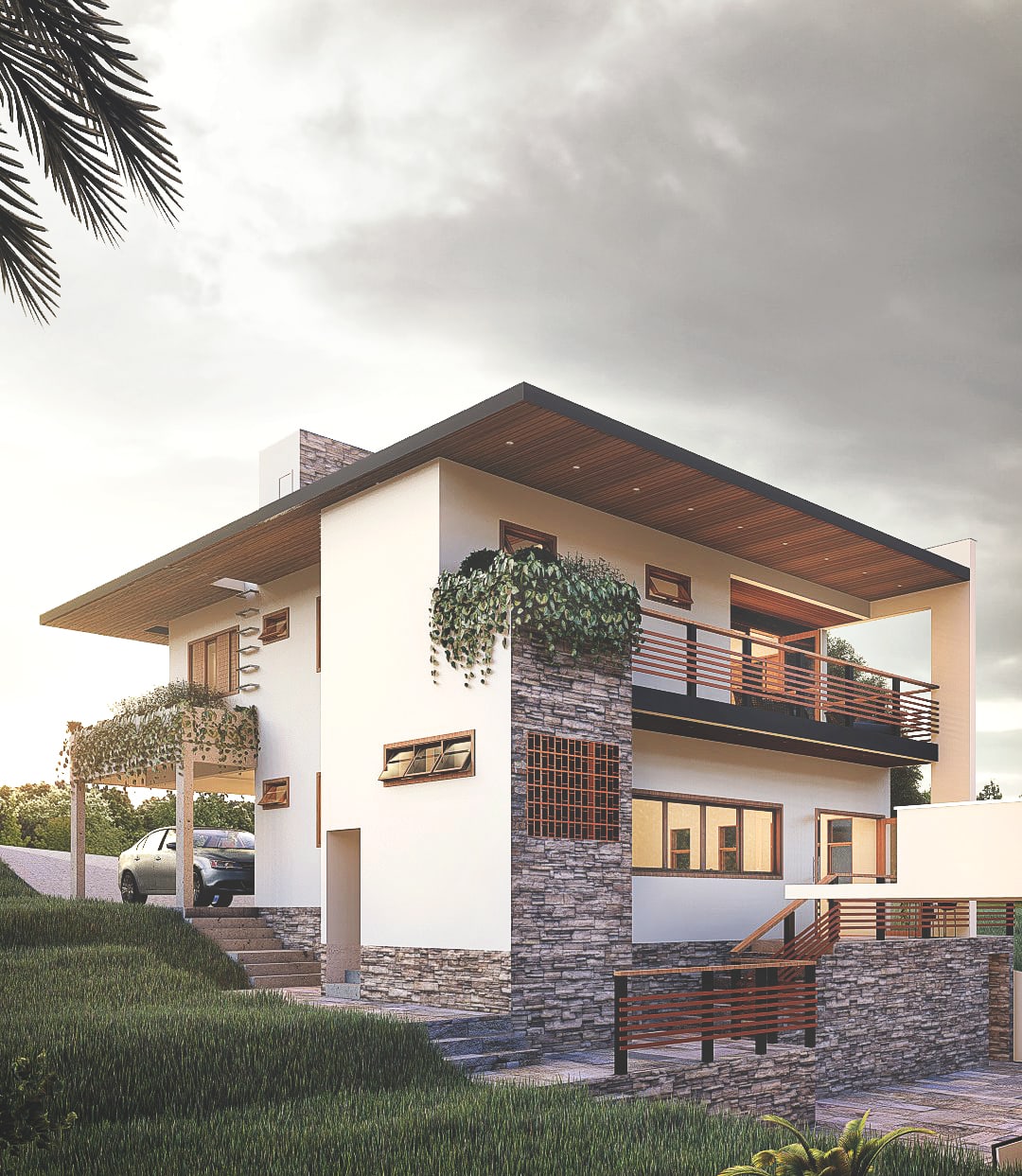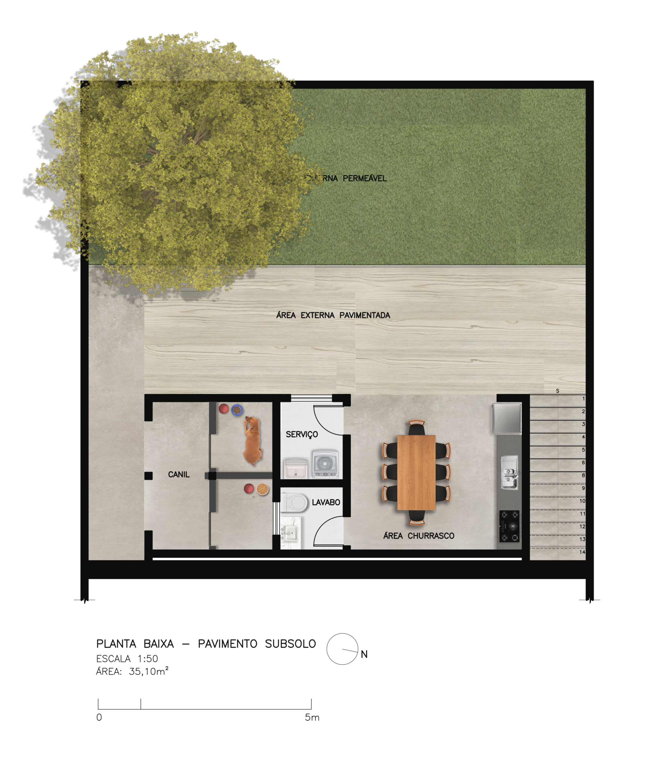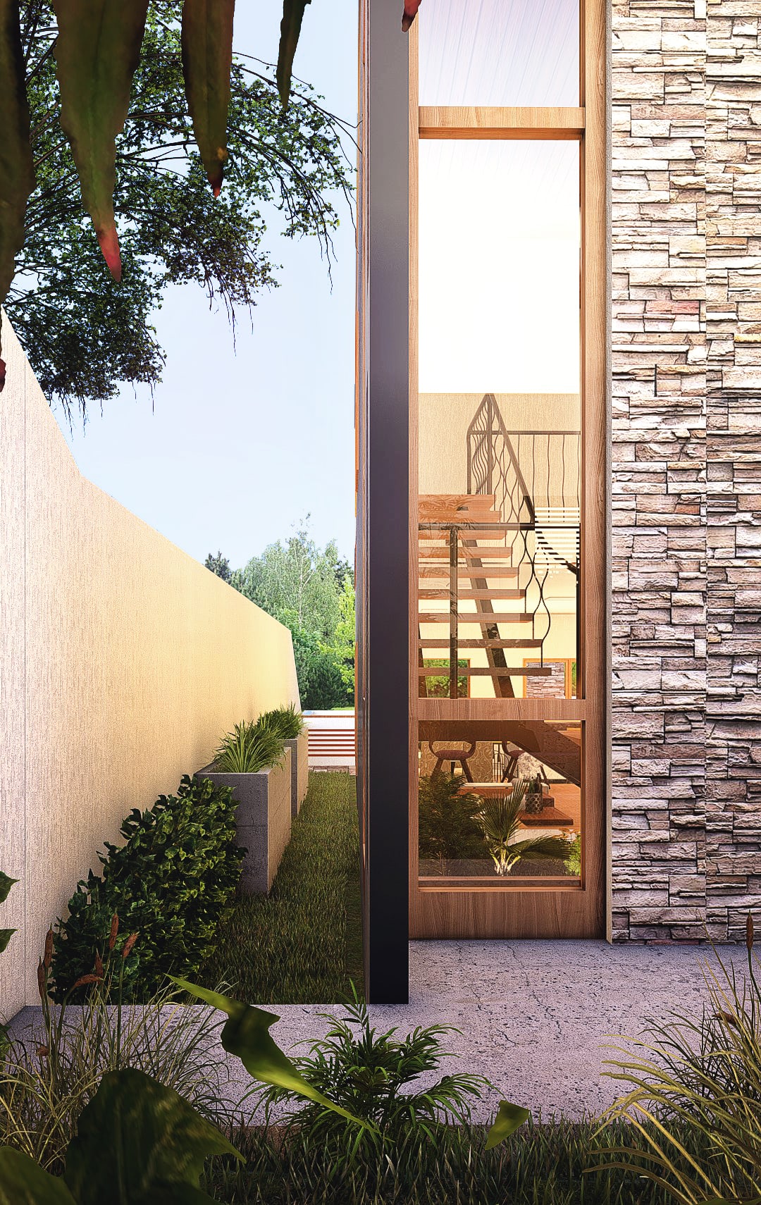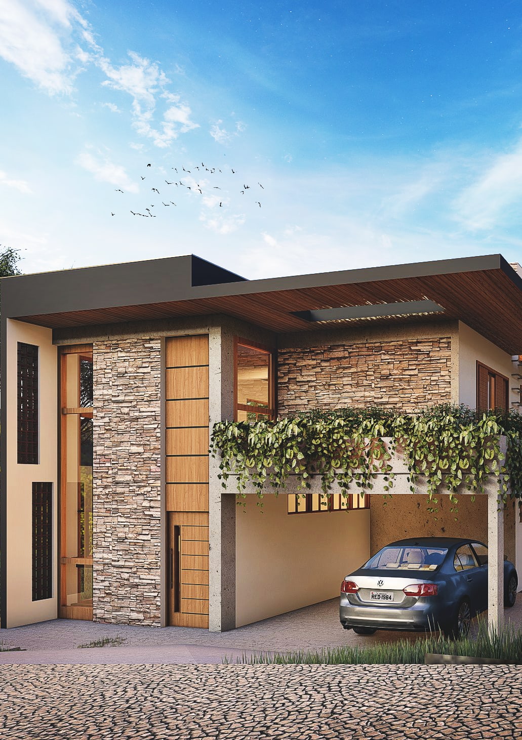 O casal gostaria de uma casa com estética contemporânea, esquadrias de madeira e uma sala de entrada com pé direito duplo. As áreas sociais deveriam ser integradas, mas articuladas de forma a manter a independência das atividades de cada ambiente.