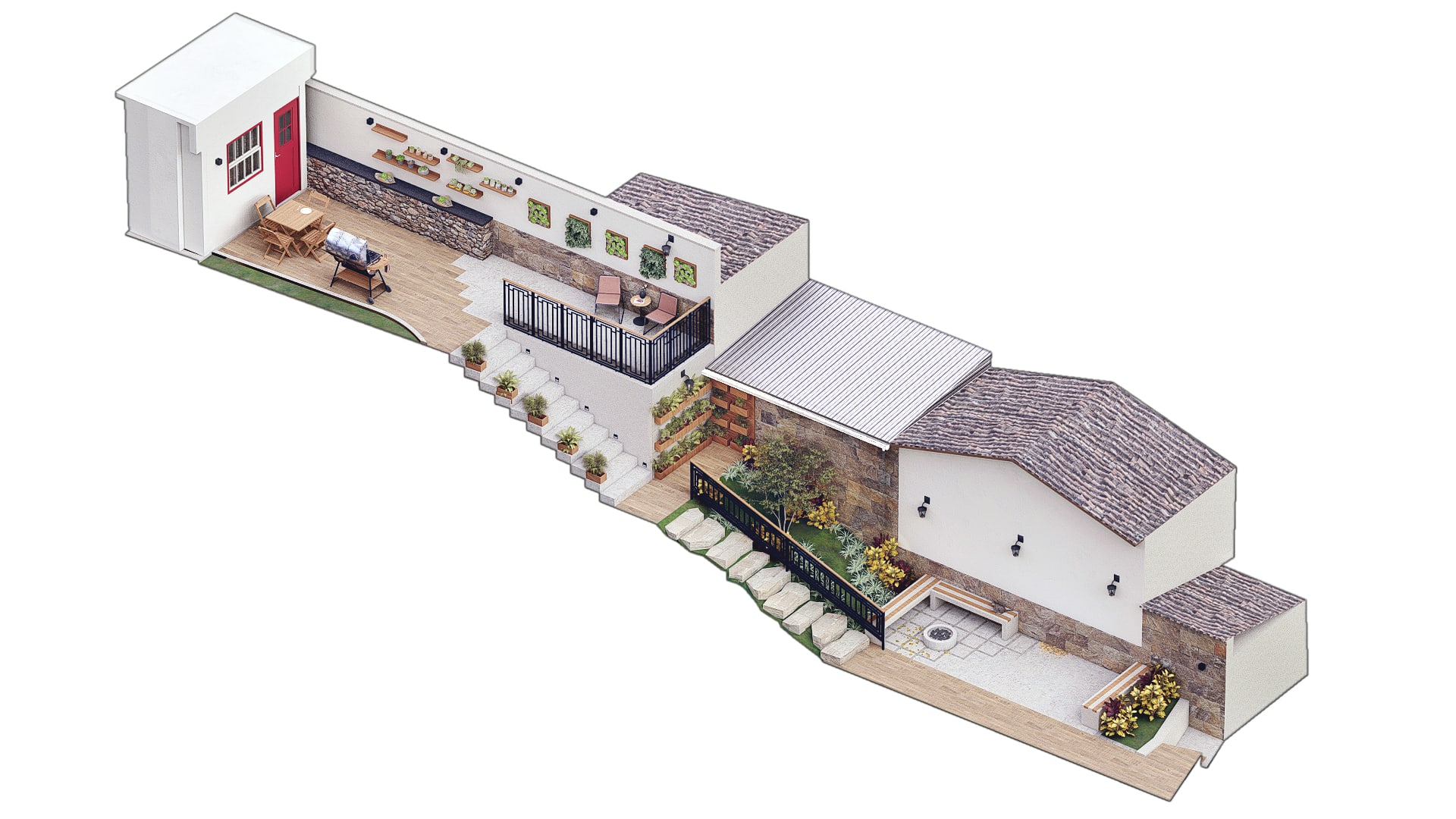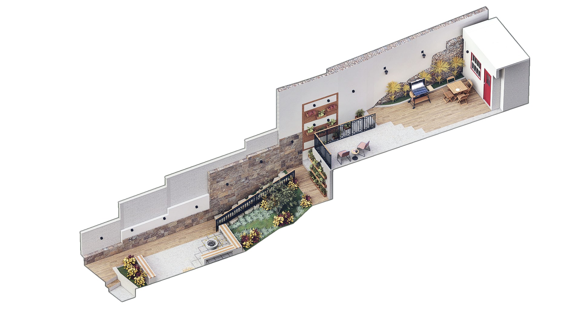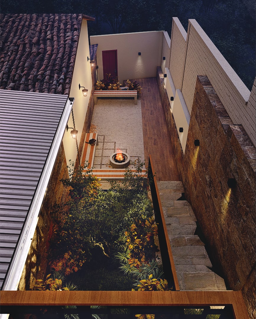 O espaço foi organizado em três patamares. No patamar do nível da casa propomos a restauração dos muros de canga dos dois lados, do esquerdo recebendo uma bancada de granito São Gabriel. O muro de divisa foi elevado para proporcionar maior privacidade ao ambiente, servindo também de suporte para receber plantas organizadas em prateleiras e jardins verticais. Do lado direito, o muro de canga vai compor o fundo do jardim com dracenas e grama baixa e no centro do patamar há espaço livre para comportar mesas e churrasqueira para festividades.