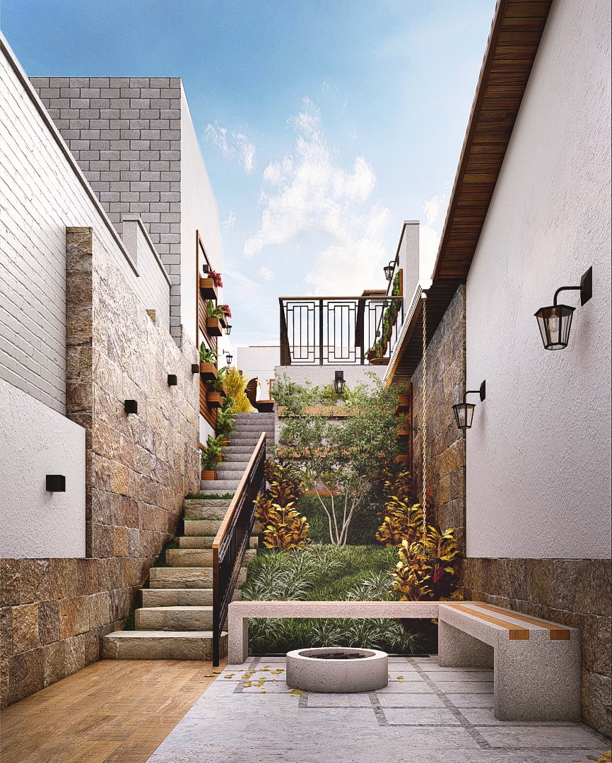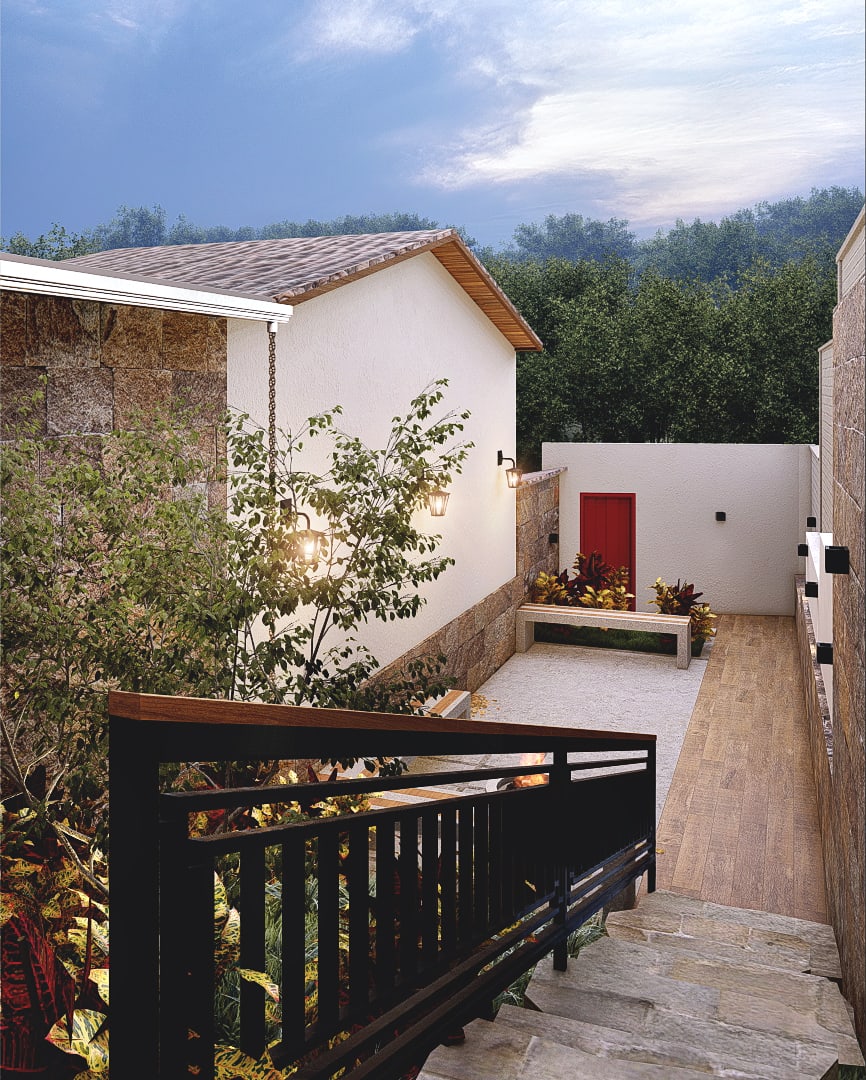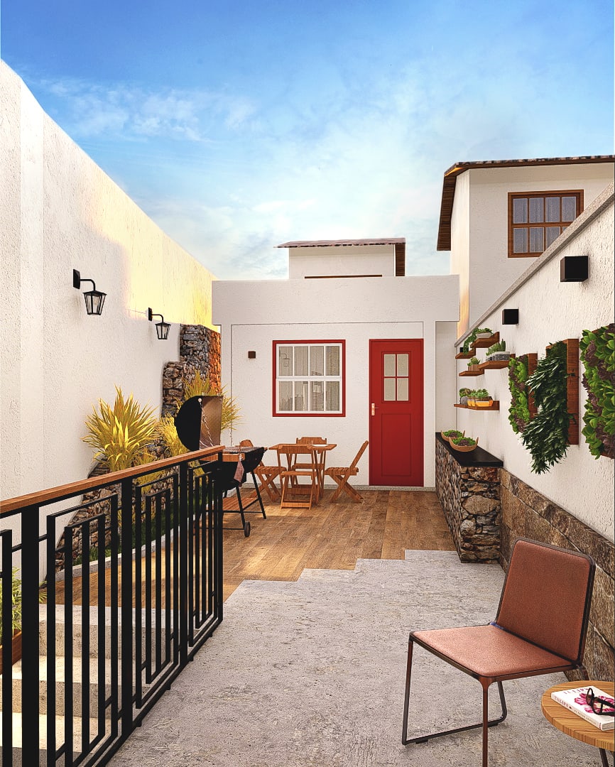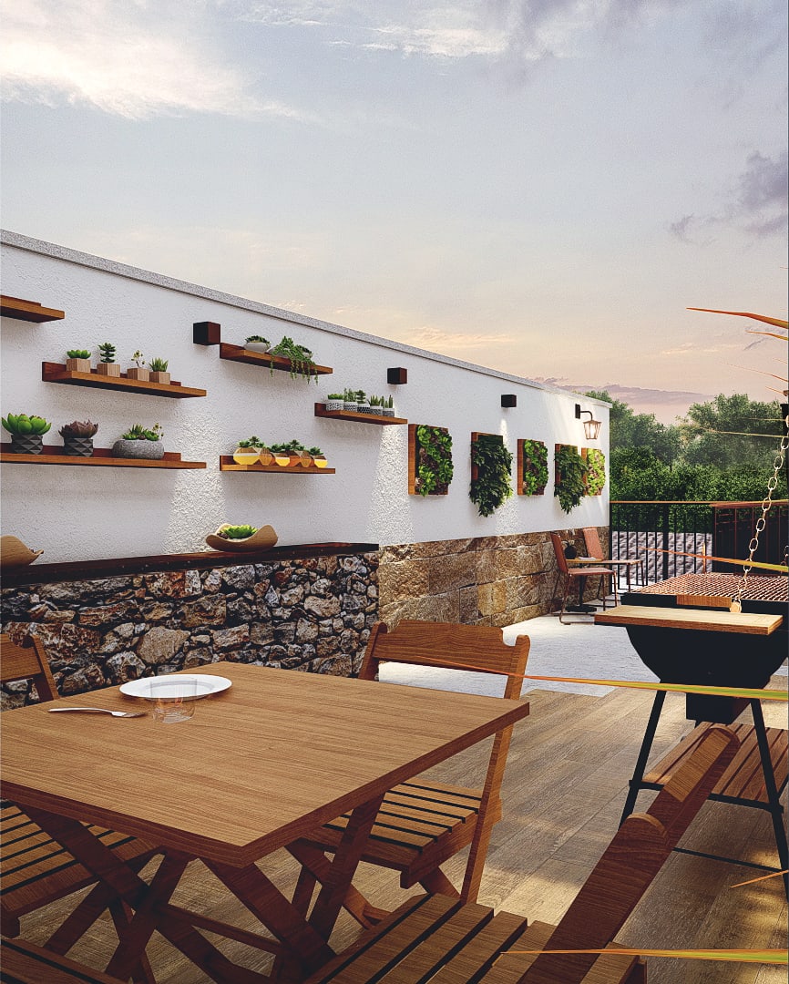 O espaço foi organizado em três patamares. No patamar do nível da casa propomos a restauração dos muros de canga dos dois lados, do esquerdo recebendo uma bancada de granito São Gabriel. O muro de divisa foi elevado para proporcionar maior privacidade ao ambiente, servindo também de suporte para receber plantas organizadas em prateleiras e jardins verticais. Do lado direito, o muro de canga vai compor o fundo do jardim com dracenas e grama baixa e no centro do patamar há espaço livre para comportar mesas e churrasqueira para festividades.