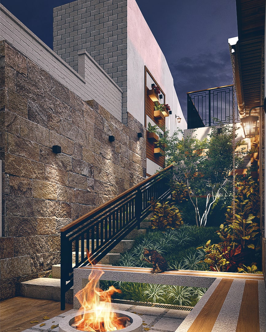 O nível inferior possui espaço amplo e aconchegante com bancos de concreto e madeira em volta de uma lareira de chão e espaço livre para receber convidados. O piso de porcelanato em madeira acompanha a circulação de todo o ambiente levando até o portão de saída.