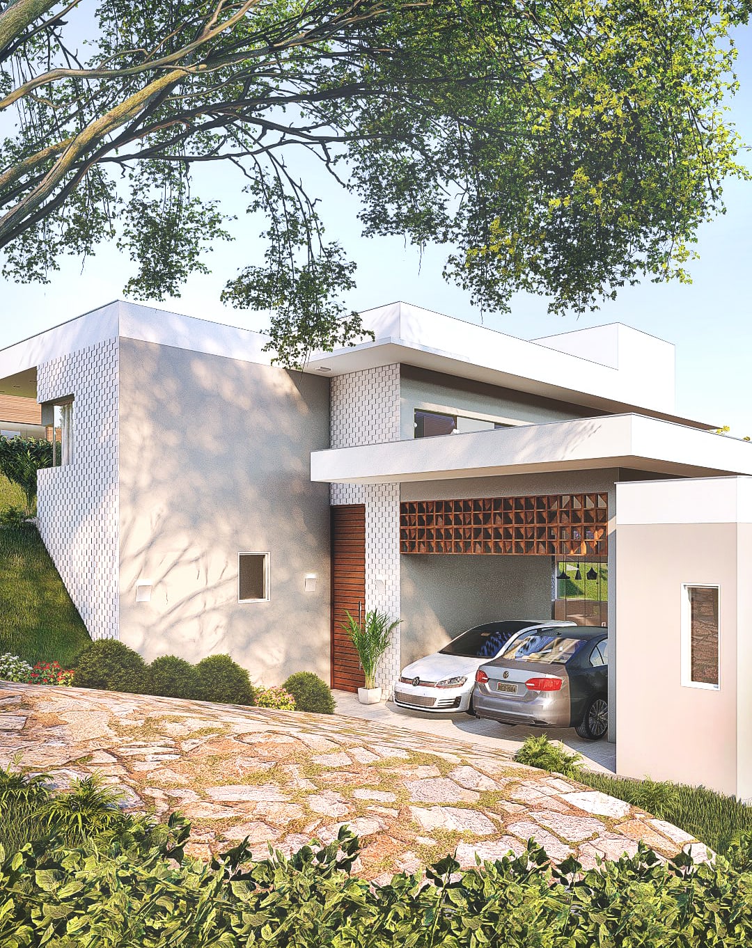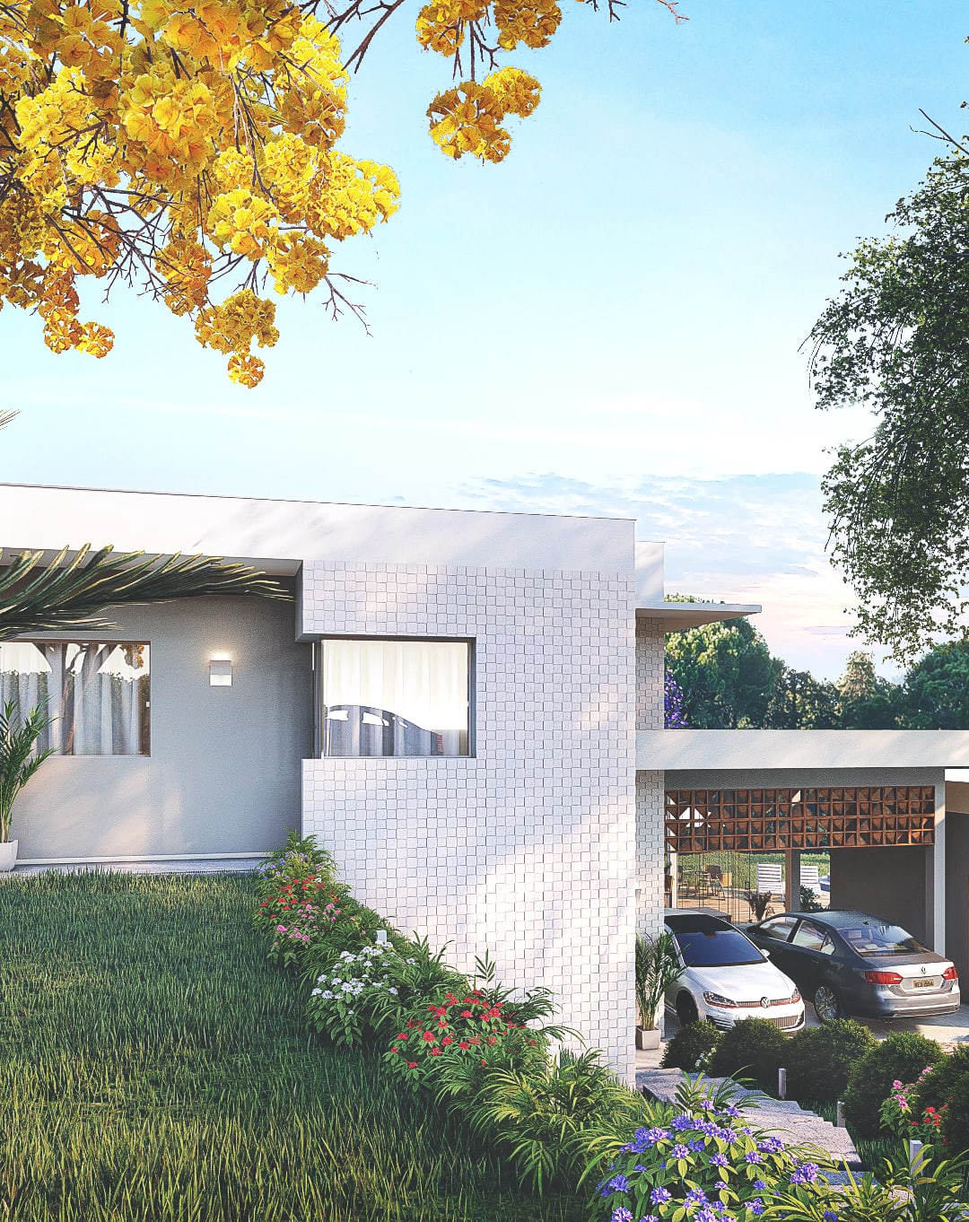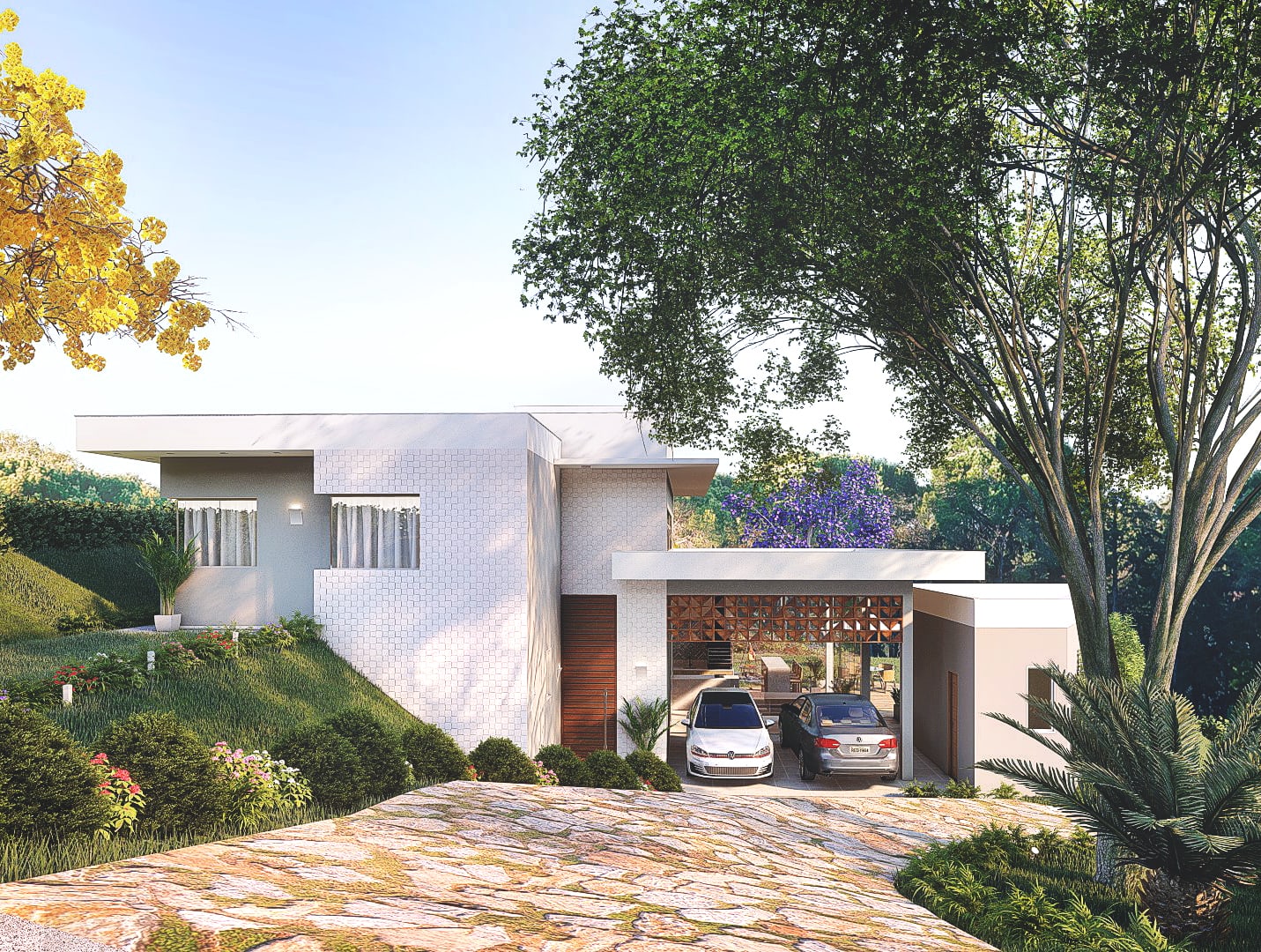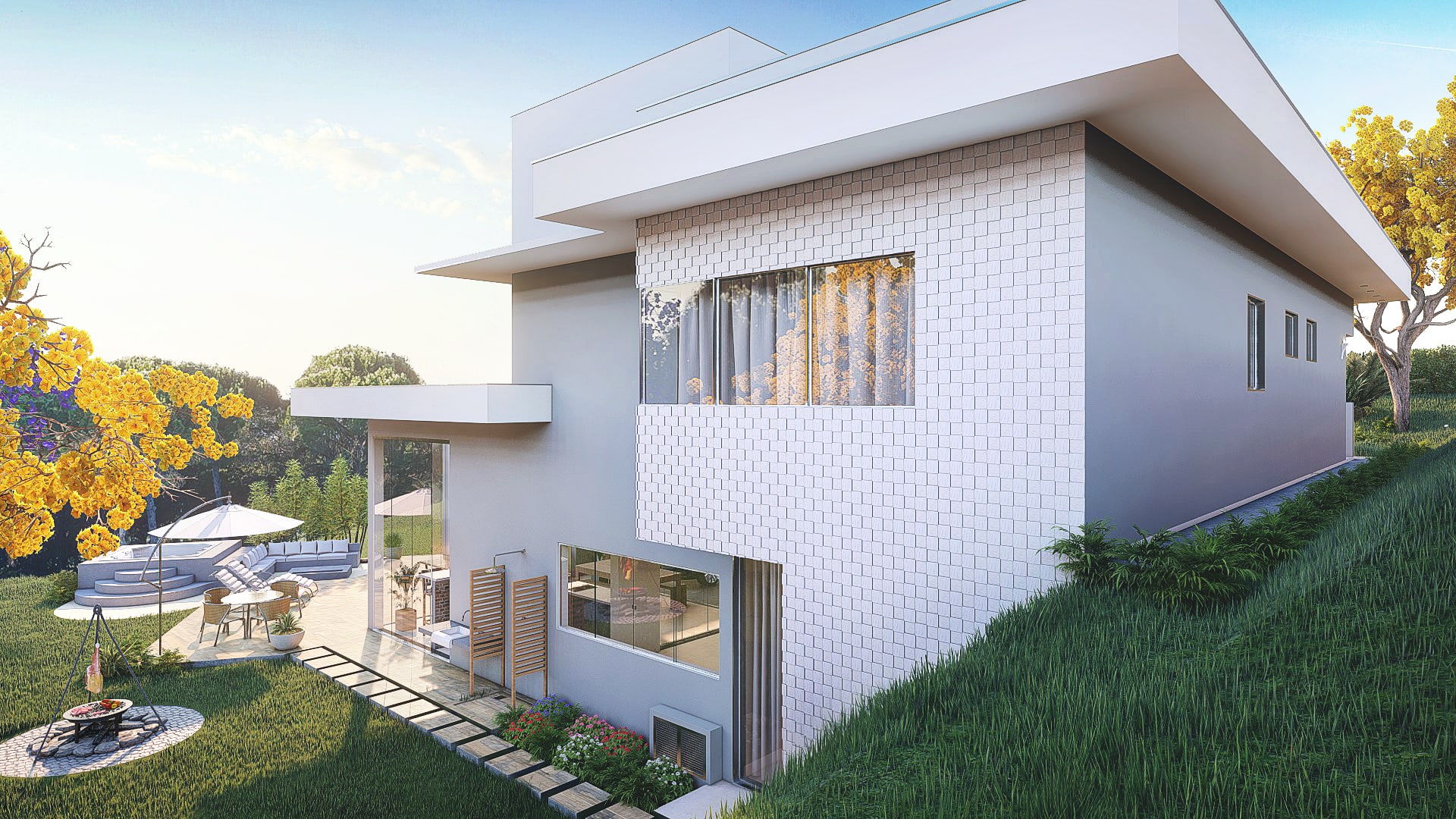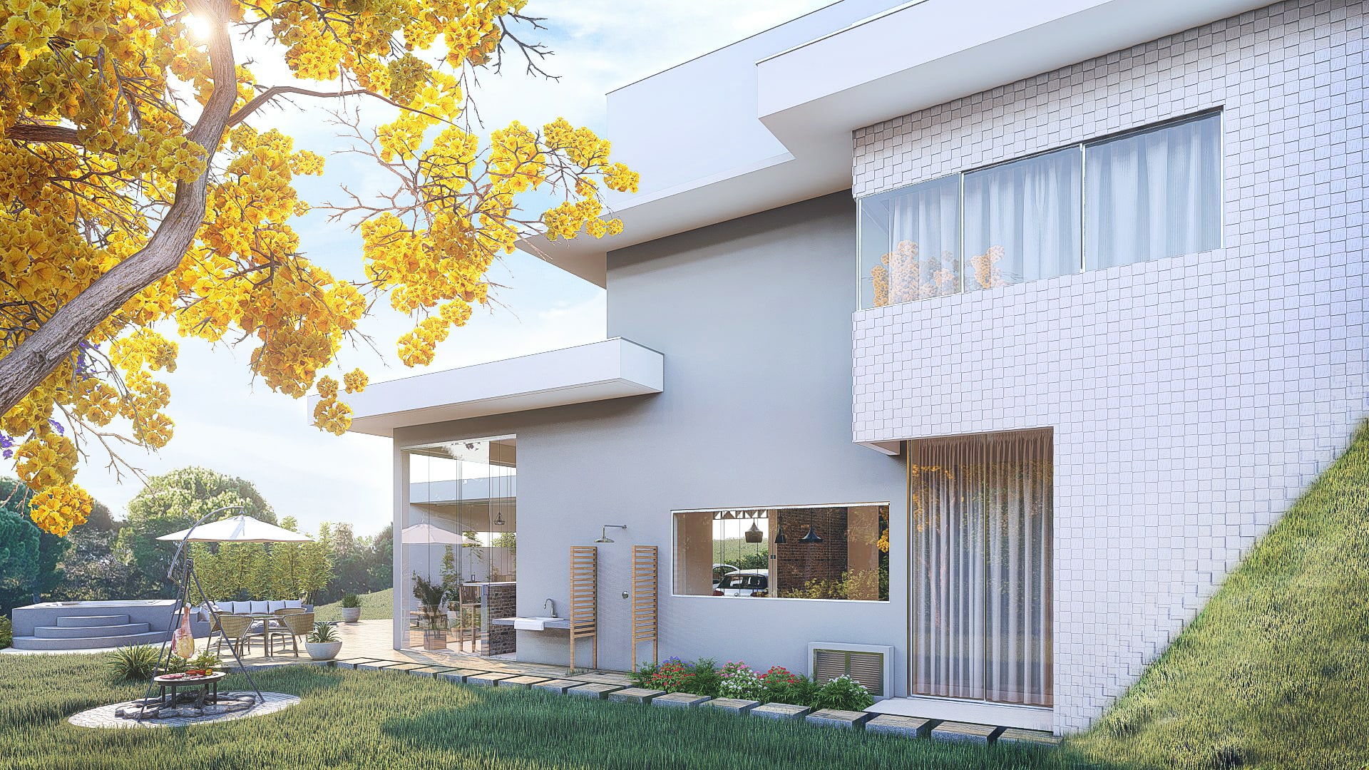 O cliente demandava um espaço agradável, que atendesse as suas demandas e gostos pessoais além de explorar o potencial da ampla área externa ao redor da edificação. O projeto ainda inclui o tratamento de todoas as fachadas.