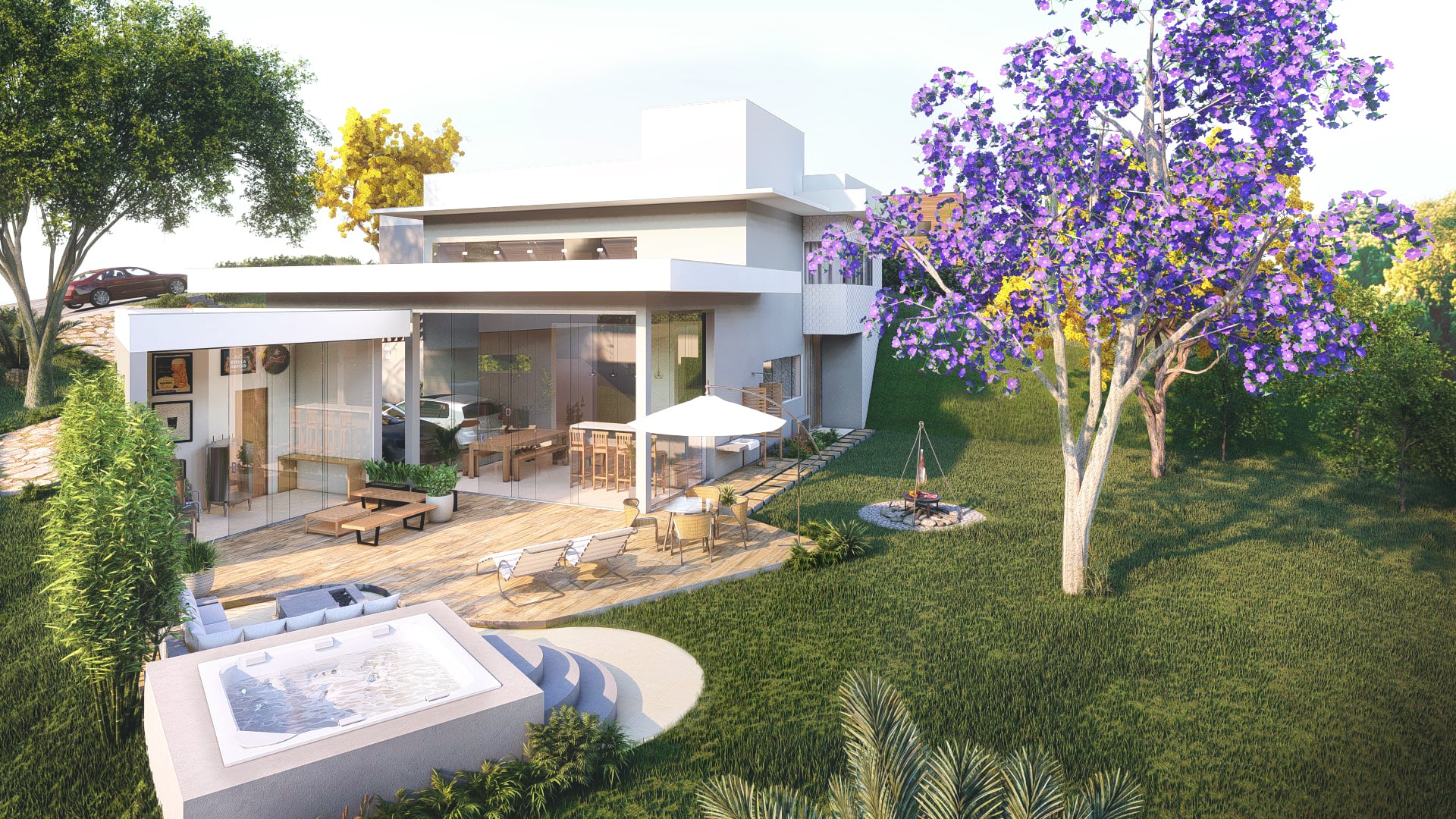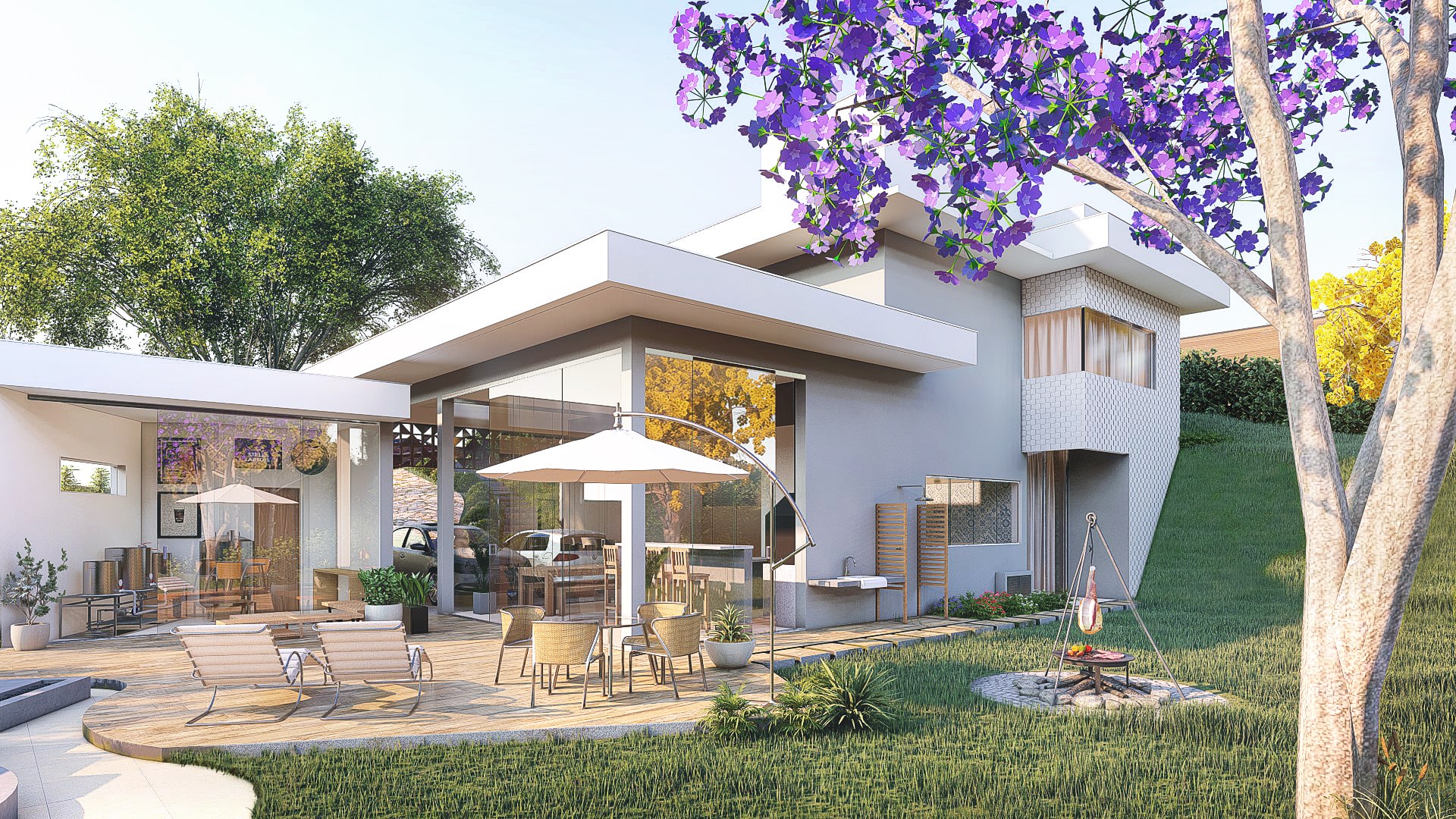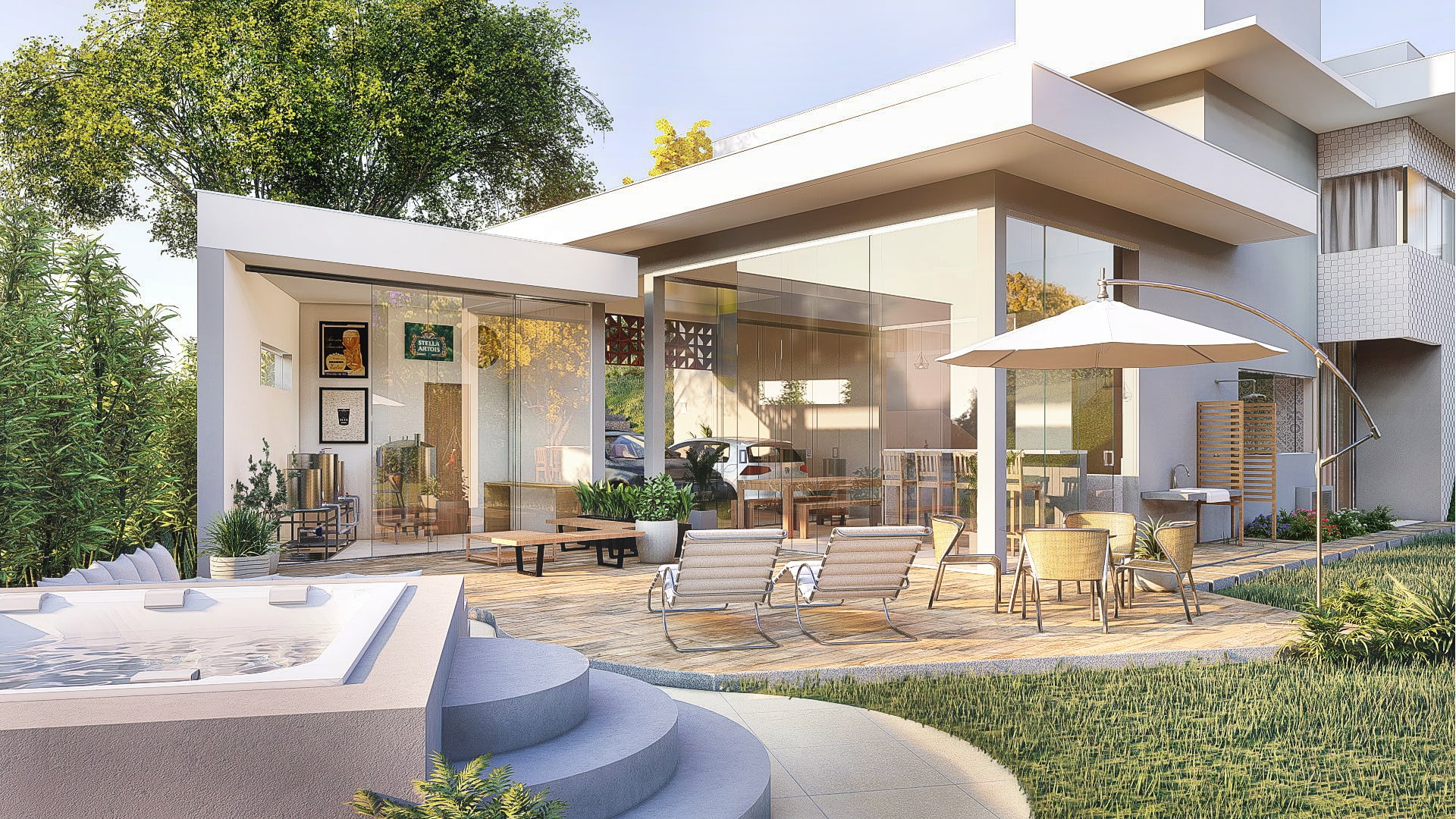 O projeto foi pensado de modo a proporcionar um espaço dinâmico e integrado com o restante da casa, em um aspecto natural e contemplativo. Ele conta com deck, spa, ducha, churrasqueira de chão e um amplo jardim.