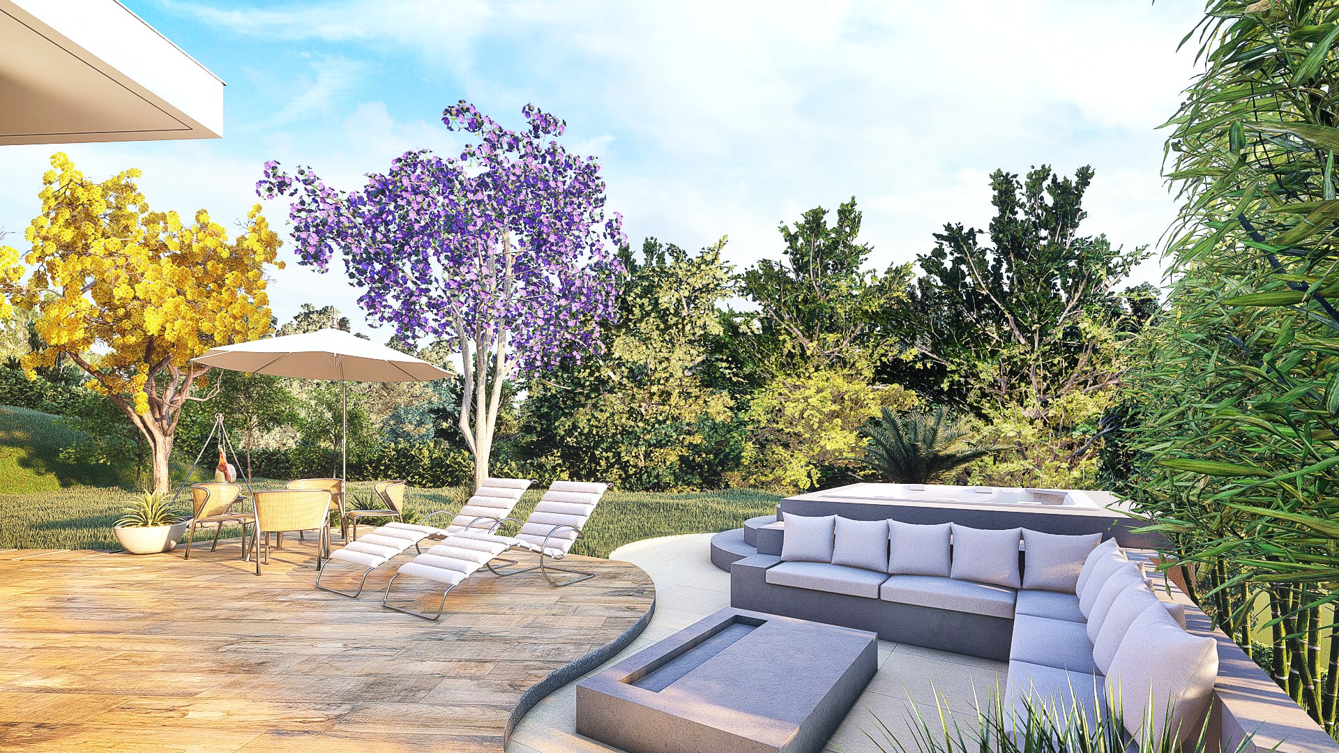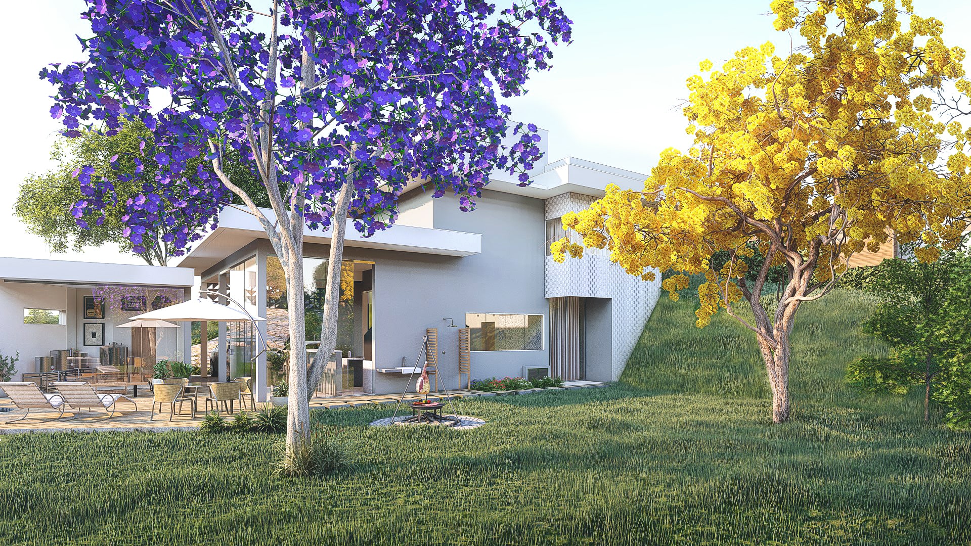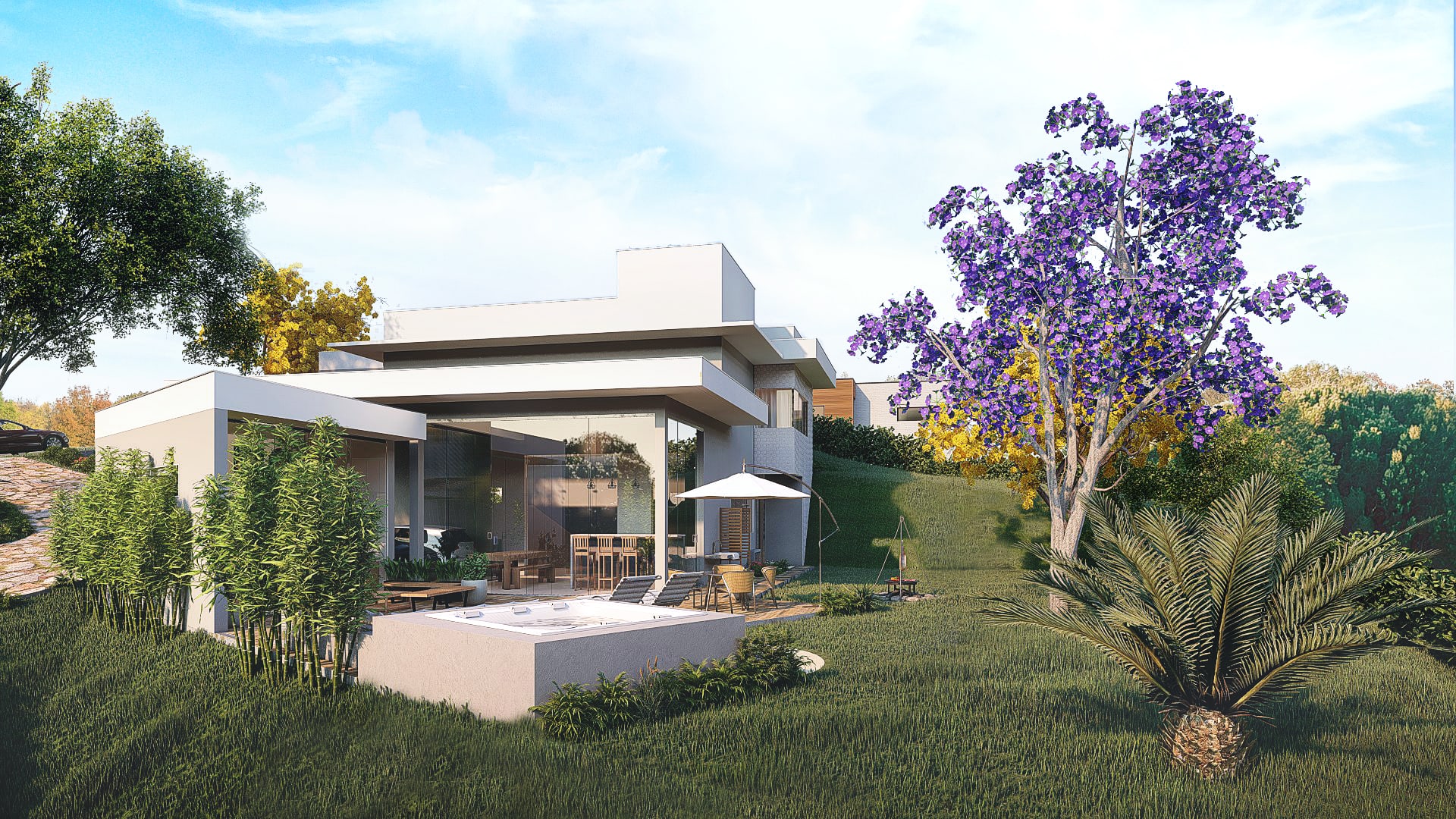 O projeto foi pensado de modo a proporcionar um espaço dinâmico e integrado com o restante da casa, em um aspecto natural e contemplativo. Ele conta com deck, spa, ducha, churrasqueira de chão e um amplo jardim.