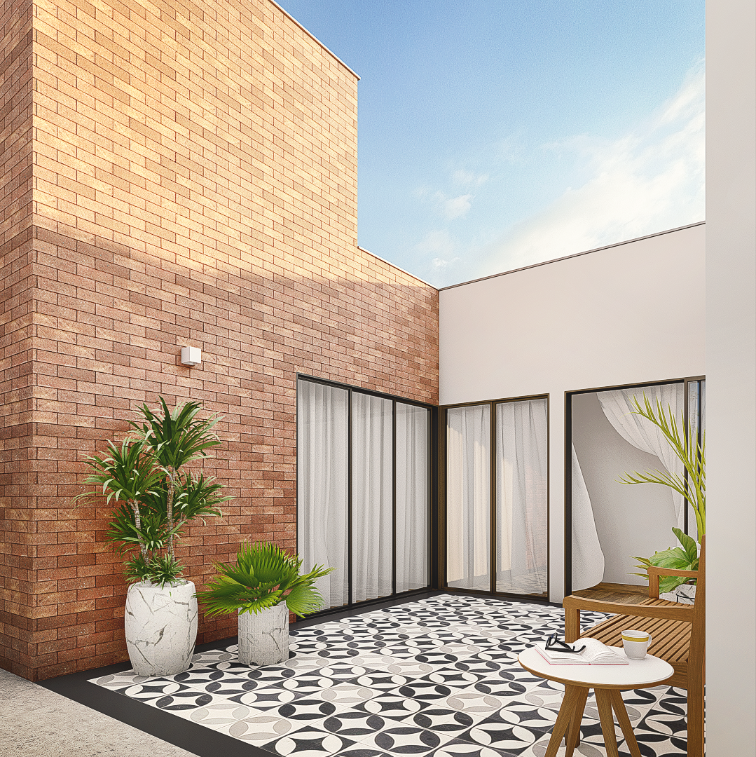 O ponto de maior destaque no projeto é o pátio interno, que faz a integração entre os ambientes proporcionando uma maior entrada de luz natural e ventilação. O pátio garante uma maior permeabilidade visual entre os cômodos da casa, aumentando a relação entre o interior e o exterior. Além de ser um espaço de lazer, contemplação e permanência, perfeito para pequenas reuniões e afazeres mais íntimos do dia-a-dia.