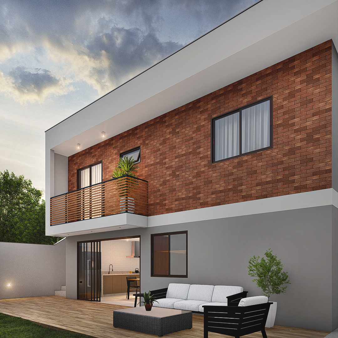 A parte posterior da casa é destacada pelas linhas retas presentes nas platibandas, paredes e varanda e é marcado pelas grandes aberturas. Possui um grande deck que faz a integração com o espaço gourmet, aumentando-o, junto a um grande gramado que torna o espaço muito mais agradável.